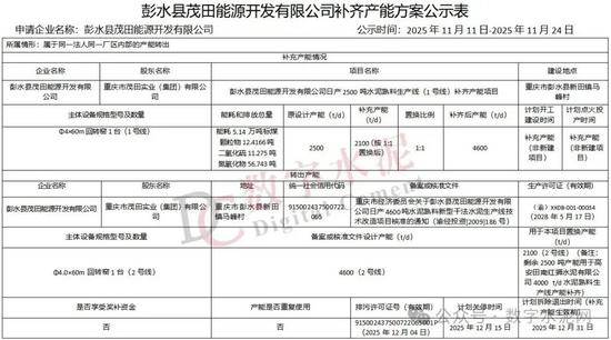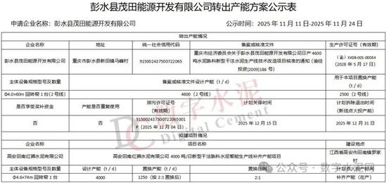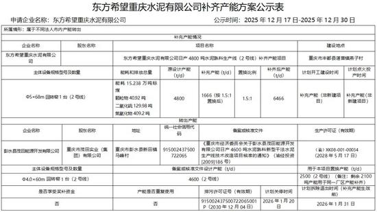 12月17日,重庆市经济和信息化委员会发布《关于彭水县茂田能源开发有限公司、东方希望重庆水泥有限公司补齐水泥产能的公示》称,按照《工业和信息化部〈关于印发水泥玻璃行业产能置换实施办法(2024年本)〉的通知》(工信部原〔2024〕206号)等文件的规定,彭水县茂田能源开发有限公司拟将日产4600吨水泥熟料生产线2号线中的2100吨产能置换同一厂区内日产2500吨水泥熟料生产线1号线用于补齐产能,剩余2500吨产能跨区转出至东方希望重庆水泥有限公司用于日产4800吨水泥熟料生产线2号线补齐产能。经彭水县经济信息委审核,现予以公示。2025年11月12日发布的《关于彭水县茂田能源开发有限公司补齐、转出水泥产能的公示》废止