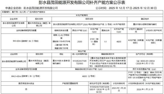 根据公示,彭水县茂田能源开发有限公司日产2500吨水泥熟料生产线(1号线)补充产能2100t/d,补充后产能4600t/d,置换比例为1:1。