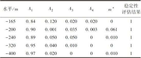 由上述分析可知,-165 m水平在充填治理之后,其稳定的可信度大小为0.84,表明-165 m水平处于稳定状态。-200、-240、-320、-400 m水平稳定的可信度大小分别为0.90、0.89、0.95和0.97,即新立矿区各分段岩体状态为“稳定”的可信度均大于80%,说明各分段岩体均较为稳定,其中,-165 m水平稳定性相对较差,其次为-240 m水平,而-400 m水平稳定性最好。随着分段深度增加,岩体稳定性基本呈上升趋势,这是由于三山岛金矿为海下开采矿山,且岩体被上盘断层、下盘破碎带所控制,上部水平更加靠近海水,突水风险更大,岩体稳定性也相对较差