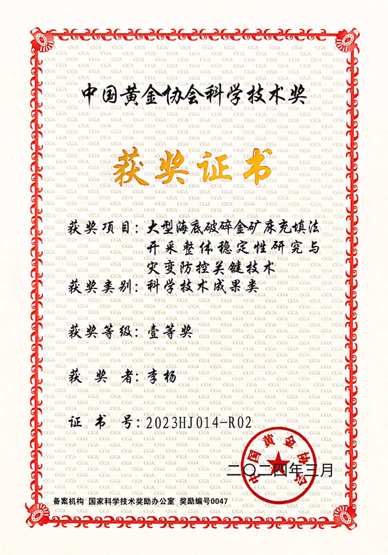本研究相关成果获得中国黄金协会科学技术奖一等奖,项目名称:大型海底破碎金矿床充填法开采整体稳定性研究与灾变防控关键技术。