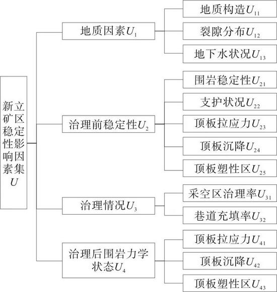 新立矿区地质环境复杂,治理工程量大,影响矿区岩体稳定性的因素很多,为稳定性评价带来很多困难,并且诸如地质条件、开采强度、治理情况等因素对矿区治理后稳定性的影响程度不同。选择指标时,应遵循“以少量指标尽可能地反映出最重要、最全面信息”的原则。综合矿区现状形成原因及过程,建立了矿区岩体稳定性影响因素指标体系。从地质因素()、治理前稳定性()、治理情况()、治理后围岩力学状态()4个维度,细分出13个因子。