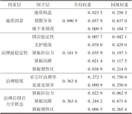 通过层次分析法对新立矿区的各个因素及因子进行评价,由判断矩阵进行各个因素及因子的权重以及全局权重计算,量化了关键因子的影响程度。治理情况()和治理后力学状态()的权重占比最高,均为0.363 6,而地质因素()影响最小为0.090 9。在因子层中,采空区治理率对稳定性影响最大,其次是治理后顶板沉降和顶板塑性区。
