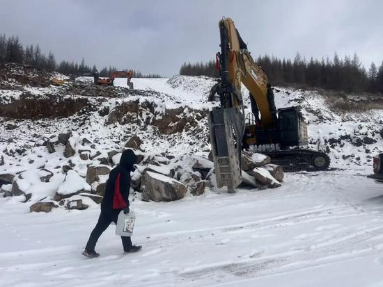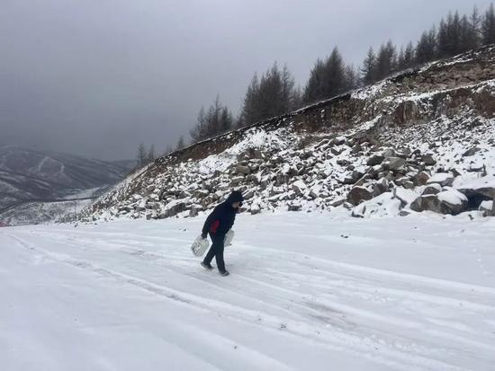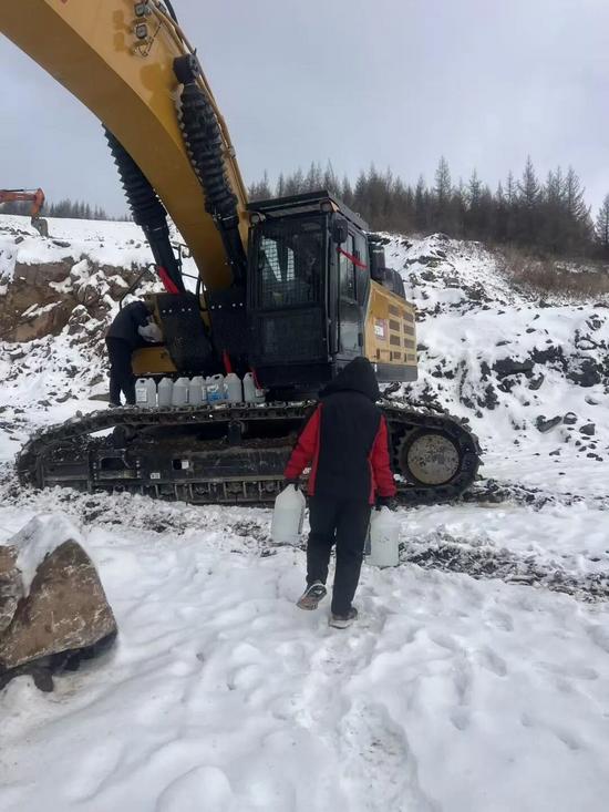 车行至山脚下,积雪已封死去路,车轮在厚雪中原地打滑。“车开不上去,那就走上去!”话音未落,两人已裹紧棉衣,扛起20斤/桶的尿素踏上山路。积雪没过脚踝,结冰的路面滑如镜面,每一步都需小心翼翼。他们往返4趟,16桶尿素的重量压得肩膀发红,手套冻得僵硬发麻,摔倒了便迅速爬起,没人顾得上数摔了几跤、歇了几次,眼里只有山顶上那台三一设备。