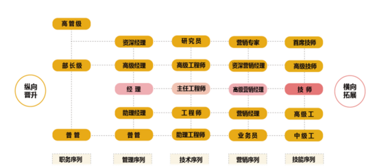 员工既可纵向逐级晋升,也可横向申请跨通道发展,既符合员工全方位发展要求,也可满足公司复合型人才战略的发展需要。