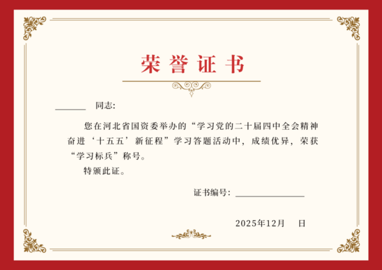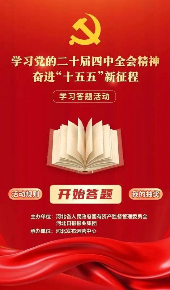 党的二十届四中全会指出“学习好贯彻好全会精神是当前和今后一个时期全党全国的重大政治任务。要通过各种方式,组织好全会精神的学习、宣讲、宣传,使全党全社会领会好全会精神。”为更好引导广大干部群众深入学习全会精神,河北省人民政府国有资产监督管理委员会、河北日报报业集团联合开展“学习党的二十届四中全会精神 奋进‘十五五’新征程”学习答题活动。