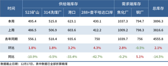 从基本面来看,供应端12月份煤矿产量维持低位,不少煤矿有自主控产现象,而进入1月份,煤矿产能有效释放之后,产量将明显回升。而蒙煤在12月完成年底冲量的目标之后,1月通关车数预计将有所下滑,但是12月的高通关将对口岸造成极大的库存压力,口岸库容面临挑战。需求端1月高炉检修预计告一段落,但淡季铁水产量预计回升缓慢。因此短时间内炼焦煤供需矛盾难有大的缓解,冬储补库对行情的提振作用预计有限,不过相较去年同期,炼焦煤库已有明显下滑,库存压力不大,且主产地煤矿产量不高,煤价预计难以继续深跌。