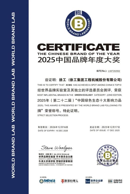 尤为值得关注的是,今年评选首次设立“中国绿色生态十大影响力品牌”专项榜单,徐工作为工程机械领域绿色转型的代表企业成功入选。
