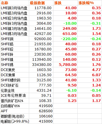 1218日,LME六种基本金属价格涨多跌少。三月期铜价收于11778美元吨,上涨0.35%。三月期铝价收于2916美元吨,上涨0.36%。三月期铅价收于1963.5美元吨,上涨0.18%。三月期锌价收于3064美元吨,下跌0.31%。三月期锡价收于42927美元吨,上涨1.54%。三月期镍价收于14641美元吨,上涨1.73%