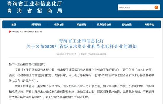 日前,青海省工业和信息化厅《关于公布2025年省级节水型企业和节水标杆企业的通知》称,根据《关于开展省级节水型企业、节水型工业园区和节水标杆企业创建工作的通知》(青工信节〔2025〕95号)要求,经各市州工信主管部门推荐、专家评审、网上公示等程序后,现将2025年省级节水型企业和节水标杆企业名单予以公布。
