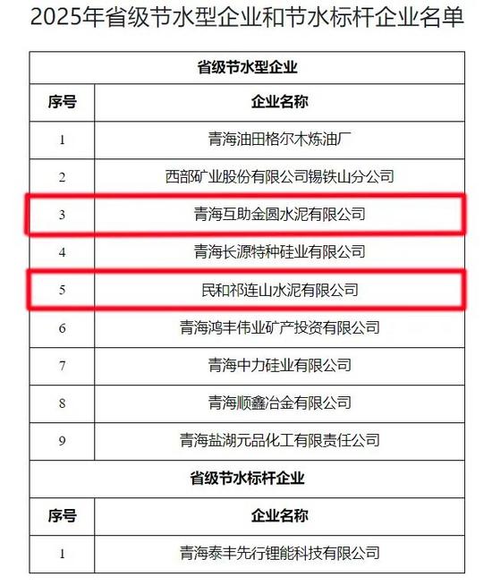 其中,青海互助金圆水泥有限公司民和祁连山水泥有限公司入选青海省级节水型企业名单。
