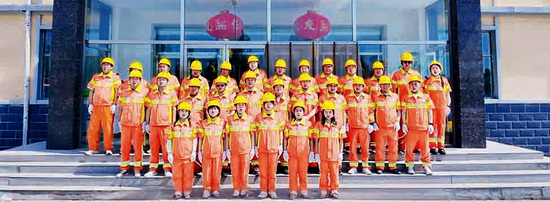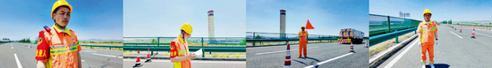 养路工身着统一安全标志服、精神饱满、整齐列队,以昂扬的姿态齐声发出“我们守护您平安出行 您呵护我们安全施工 让我们携手同行平安不止于路”的倡议。