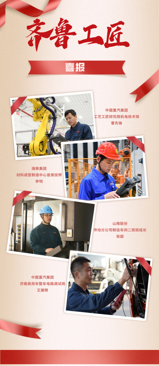 近日,山东省总工会正式发布2025年齐鲁大工匠、齐鲁工匠、山东手造大工匠及手造工匠名单。山东重工集团曹先锋、李明、张超、王建辉凭借精湛技艺、卓越贡献和敬业精神,光荣入选“2025年度齐鲁工匠”。