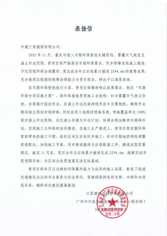 重庆地铁27号线盾构项目以冬期环保合规为底线,在2025年11月重庆环保管控关键期,将环保要求与施工推进深度结合,既实现环保合规履约,更达成全年左右线累计掘进 2244.6m 的成果,超额完成年度目标,为区间全线贯通奠定坚实基础;克服环保管控影响,组织双线同步施工,彰显轨道交通建设企业的专业素养与社会责任。