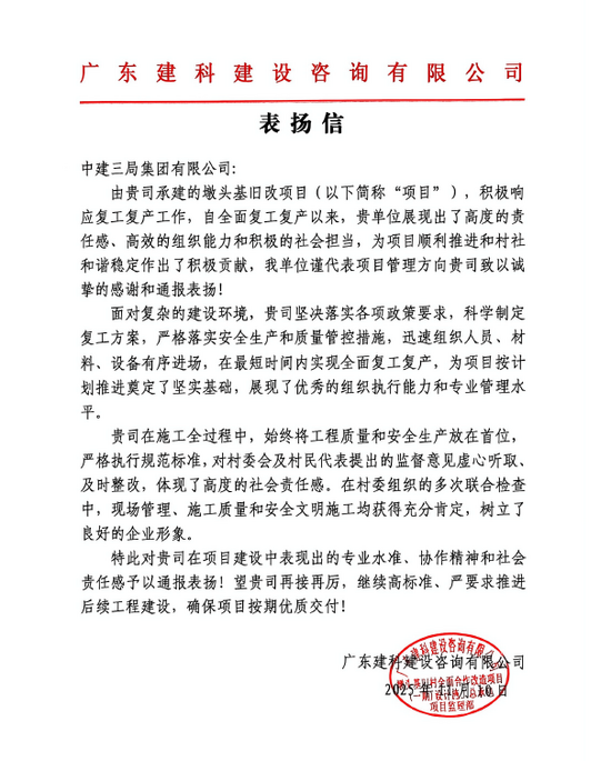 墩头基旧改项目自全面复工复产以来,始终将工程质量和安全生产放在首位,严格执行规范标准,对村委会及村民代表提出的监督意见虚心听取,及时改正。项目展现出了高效的组织能力、高度的责任感和积极的社会担当,为项目顺利推进和村社和谐稳定作出积极贡献。