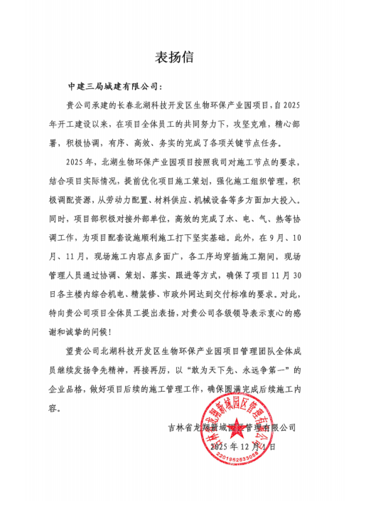 长春北湖产业园项目通过精心部署、攻坚克难,高效完成各项关键节点任务。尤其在2025年9-11月多工序穿插施工期间,团队通过高效统筹,于11月30日实现各主楼综合机电、精装修及市政外网交付标准,充分彰显了公司的高效履约能力。