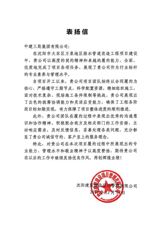 沈阳大东排水项目以出色契约精神与履约能力全面完成建设任务,项目团队以工期为主线,克服技术复杂与现场条件限制,保障各节点目标高效推进。同时团队展现出优秀协作意识与服务理念,积极沟通、主动配合,充分彰显了现代工程建设的专业水准。