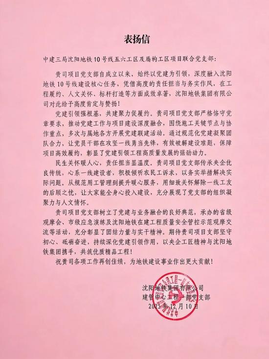 沈阳地铁10号线五六工区项目以党建为引领,将党建工作与项目建设深度融合,开展党建联建活动,党员干部攻坚一线保障项目高效履约;传承央企传统,心系一线建设者,通过规范用工、暖心服务解决农民工实际诉求,展现组织凝聚力与人文关怀;承办省级观摩会、市级应急演练等活动,树立了党建与业务融合的良好典范。