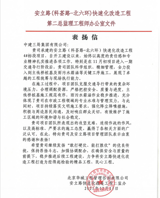安立路项目建设中,坚持安全、质量与进度并重,严格落实文明施工要求,积极沟通周边居民,展现了较强的统筹执行能力和专业管理水准,赢得各方认可。