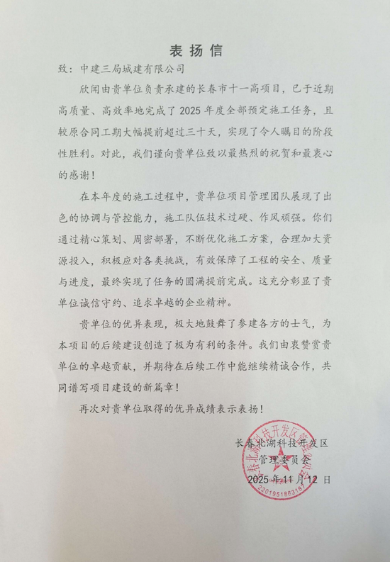 长春十一高项目已提前超过30天高质量完成2025年度全部预设施工任务。过程中,管理团队精心策划、周密部署,持续优化方案,合理配置资源,积极应对各项挑战,有力保障了工程安全、质量与进度,最终实现圆满交付。