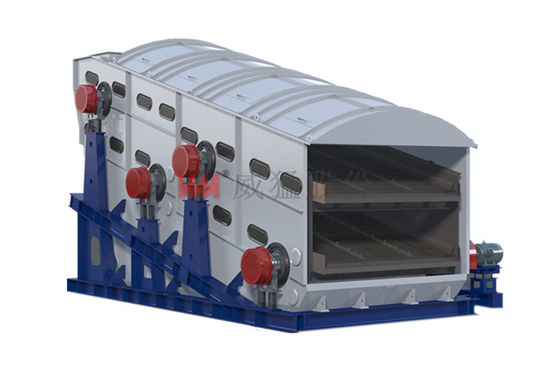 WFPS系列复频筛颠覆传统结构,实现“筛箱固定不振动,仅筛板与激振器振动+静态密封”。物料从入料口到排料端全程由多段独立筛面完成筛分,每段筛面采用“逆向启动、顺向停车”模式(启停间隔6-8秒),且可根据筛分需求灵活调整单段频率、振型与振幅——如进料端料层较厚,可采用低频高幅设计加速物料输送与分层;后端则用高频低幅设计强化筛分精度,适配工况需求更广泛。
