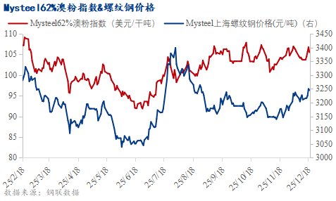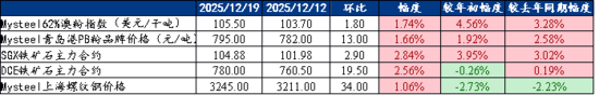 我的钢铁网:价格走势方面,本周铁矿石价格环比小幅上涨,Mysteel62%澳粉远期价格指数10.5.5美元/吨,周环比上涨1.8美元/吨,涨幅1.74%。周内铁矿石价格在103-106美元/吨区间窄幅波动,目前12月均价为105.2美元/吨。从价差来看,铁矿1/5合约价差在本周连续收缩,Mysteel65%-62%指数价差走扩至14美元/干吨以上,港口中高品价差收缩至年内低位,中低品价差继续收缩。本周黑色价格共振上涨。本周主要是在产业结构性基本面存在企稳条件和估值调整到位后,反内卷情绪推动的反弹。产业结构性基本面企稳条件包括钢厂减产比往年更积极,铁水减产速度比预期要快,有利于需求走弱后继续去库。