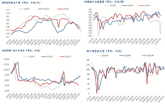 47港铁矿石到港量环比回升,处于近三年同期高位水平。根据Mysteel47港铁矿石到港量数据显示,本期值为2928.1万吨,周环比增加359万吨;12月到港量周均值为2748.65万吨,环比上月增加33万吨,同比去年增加269万吨。今年以来,47港铁矿石到港量累计同比增加718万吨,其中澳洲累计同比增加1670万吨,巴西累计同比减少308万吨,非主流累计同比减少644万吨。根据模型测算及近期天气预测,预计下期到港量回落。