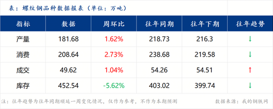 我的钢铁网:2025年12月15日-12月19日,全国螺纹钢均价为3325元/吨,周环比上涨1.09%。供应端,螺纹钢周产量181.68万吨,库存452.54万吨;需求端,消费量208.64万吨,建材周度成交量49.62万吨。