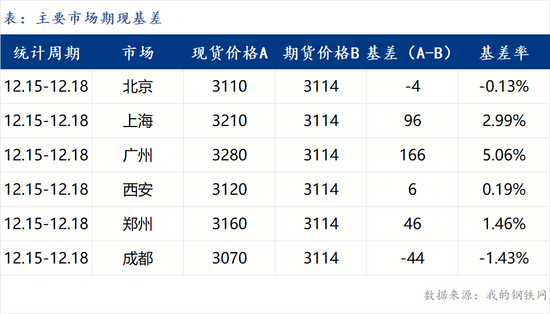 期货层面:本周期螺盘面在“反内卷”的宏观面之下,远期资金博弈加剧。周初,价格震荡趋强,但能势拉锯;周中后,由于原燃料的盘面异动,显著强化了市场对于成本面的支撑远期,成材行动方向趋于明朗,价格上行,全周呈现“震荡偏强”运行态势从期现基差来看,上海、广州、西安、郑州期货表现贴水,北京、成都期货表现升水。
