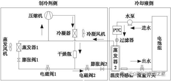 2.2 非独立机组形式图3为典型的非独立机组的电池热管理系统组成图。其中:蒸发器1为空调系统蒸发器,用于给车厢空气降温;蒸发器2为水冷机组蒸发器,冷却水与制冷剂在此完成热交换,通过降低防冻液的温度来给电池降温。两个蒸发器总成处于并联状态,二者共用一套压缩机、冷凝器、干燥瓶等部件,通过电磁阀1和电磁阀2分别控制两路制冷剂的流通,同时利用膨胀阀1和膨胀阀2分别调节两路制冷剂的流量大小。当电池需要升温时,电磁阀2关闭,水泵和PTC电液体式加热器开始工作,防冻液被PTC加热后送入电池内部换热器,给电池加热。自循环模式时,电磁阀2关闭,PTC电液体式加热器停止工作,水泵运行,水路自循环运行,避免电池内部温差过大。