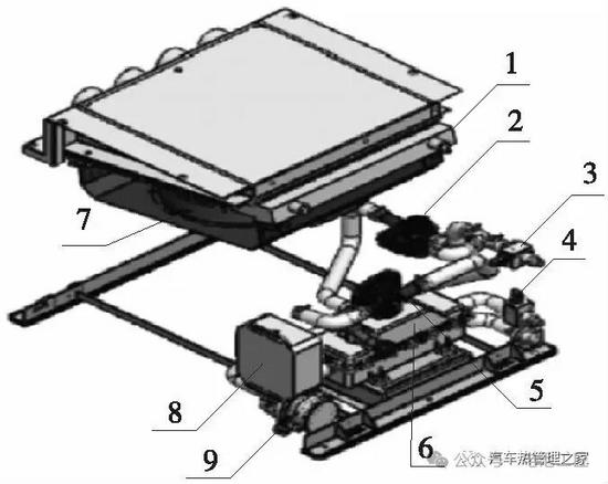 1-板式换热器;2、5-电磁阀;3、4-水温传感器;6-PTC;7-风机;8-控制器;9-水泵