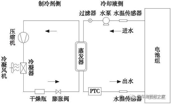 2 电池热管理系统的结构及工作原理不管是冬天还是夏天,电池的正常工作温度都是25 ℃±5 ℃,冬天需要通过电池热管理设备加热,加热的目标水温为25 ℃±5 ℃;夏天需要通过电池热管理设备降温,降温的目标水温也为25 ℃±5 ℃。下面介绍3种客车常用的液冷(热)式电池热管理系统,这3种电池热管理均属于加热冷却一体式系统,根据纯电客车使用及环境温度要求,当系统需要冷却时,直接通过电池热管理系统的换热器对防冻液进行降温;当系统需要加热时,电池热管理水路循环系统中串接的PTC电液体式加热器对防冻液进行加热。