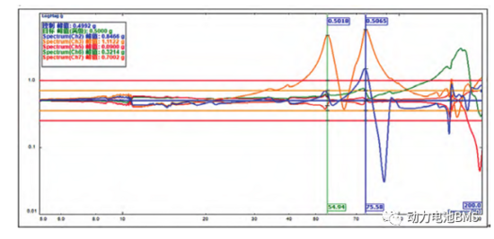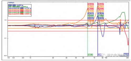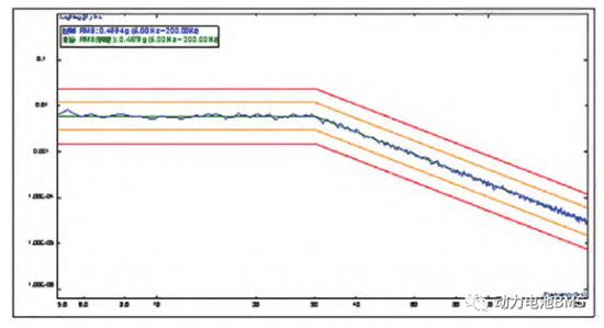 本文选用了一款乘用车用动力电池系 统,参考 GB38031 进行随机振动试验。振 动试验前,对电池包进行性能测试,包括容 量、绝缘和气密性等,功能检查正常后开展 振动试验。通过夹具将电池包固定在振动台 上,电池包和夹具的固定方式、螺栓规格和 实车装配保持一致。控制点传感器布置在夹 具与电池包固定的螺栓附近,采用 4 个对角 位置的传感器的进行算术平均值控制。在随 机振动前后进行扫频试验,以测试样品的固 有频率,扫频范围 5 至 200Hz,扫频速度 1Oct/min, 振动量级 0 .5g。Z 方向振动前 后的扫频数据见图 2 和图 3, 由图可见 Z 方 向振动前一阶固有频率是 57 .06Hz, 振动后 的一阶固有频率是 54 .94Hz, 试验前后变化 不大。按照 GB38031 的要求, 样品先后在 Z、 Y、X 三个方向上做随机和定频振动,三个 方向的随机振动功率谱密度见图 4 ~图 6。振动试验过程中,电池包的监控参数无异常 变化, 外观结构完好, 无泄漏、破裂等现象。试验后,对电池包进行性能测试,电池包绝缘正常、容量无明显变化、气密性合格,符 合测试要求。