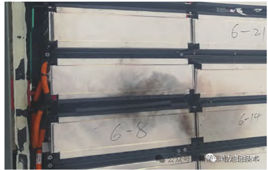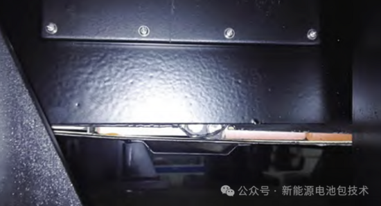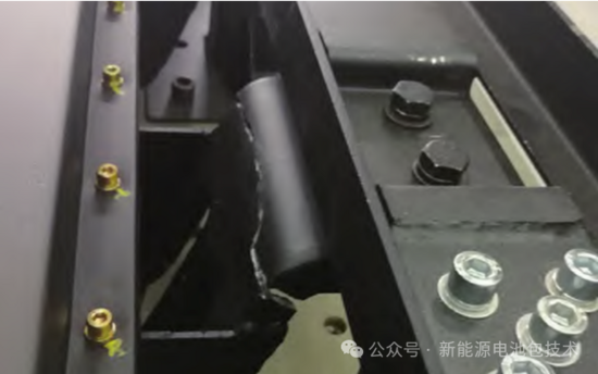 根据以往的振动试验经验,动力电池系 统的振动测试失效形式主要有下面几个方 面:1) 电池包上下壳体开裂, 见图 7 所示;2) 电池包的挂耳或嵌套螺帽开裂, 见图 8 所示;3) 高压汇流线断裂;4)单体电压采样线松 动或断裂;5) 模组固定螺栓松动造成模组 移动, 见图 9;6) 控制系统(BMS) 松动 或断裂等。