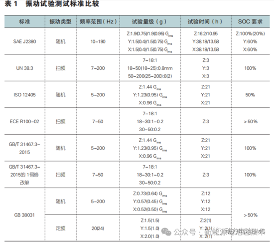 3)GB 38031 是我国车用动力电池领域 的第一个国家强制标准,它将代替 GB/T 31467 .3,规范车用动力电池的测试要求。该标准的振动试验规定将电池包或系统的 SOC 调整为不低于 50%,振动试验载荷根 据车型的不同也有所不同,试验分为随机振 动和定频振动两部分。其中随机振动的功率 谱密度(PSD)是根据大量不同车型在道路 行驶中的实测数据而来,更接近我国新能源 车辆的动力电池系统的实际受载情况。与 GB/T 31467 .3 和其 1 号修改单相比,GB 38031 的振动试验更加合理。国内外动力电池系统的振动标准既有联 系,又有区别 [1] ,很多是有 ISO 12405 和 SAE J2380 演化而来,但各标准的试验条 件(例如频率范围、试验量级)和试验样品 的要求有所不同,各标准的主要参数对比见 表 1。